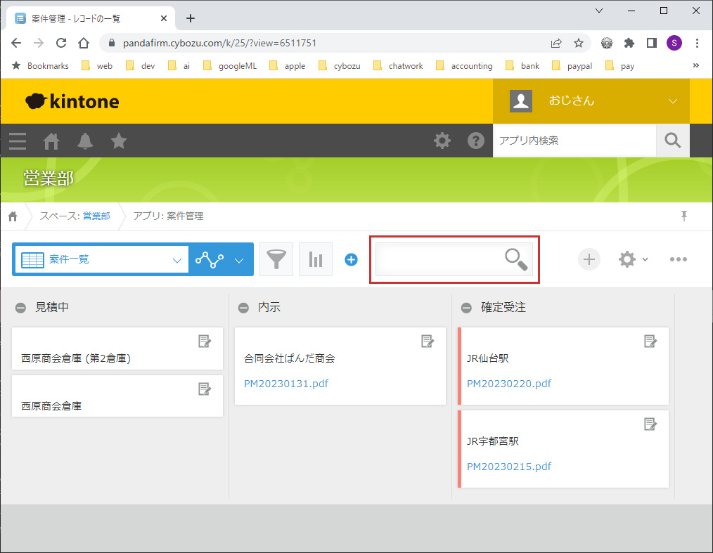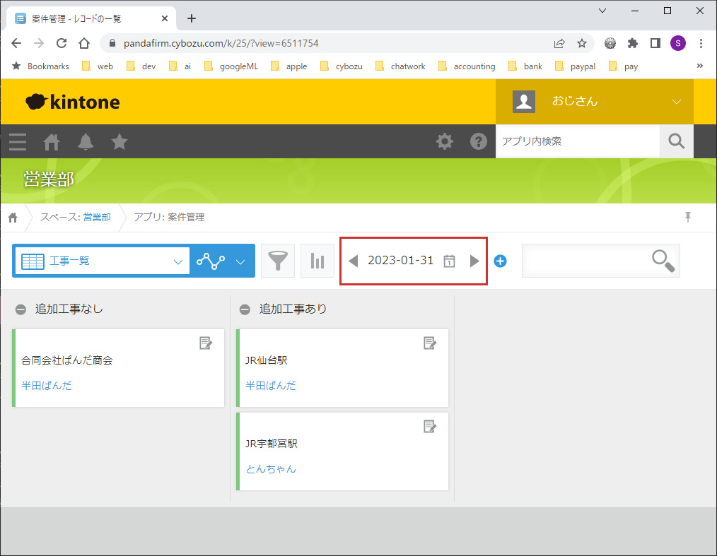 一覧画面に移動すると、設定画面で作成した内容でカンバンビューが表示されます。
