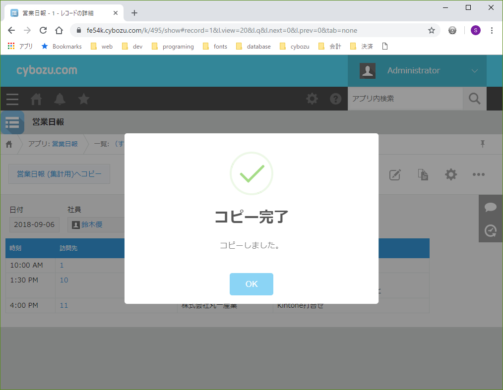 表示されたボタンを押下すると、設定画面で指定したアプリへレコードがコピーされ、コピー完了時にメッセージが表示されます。